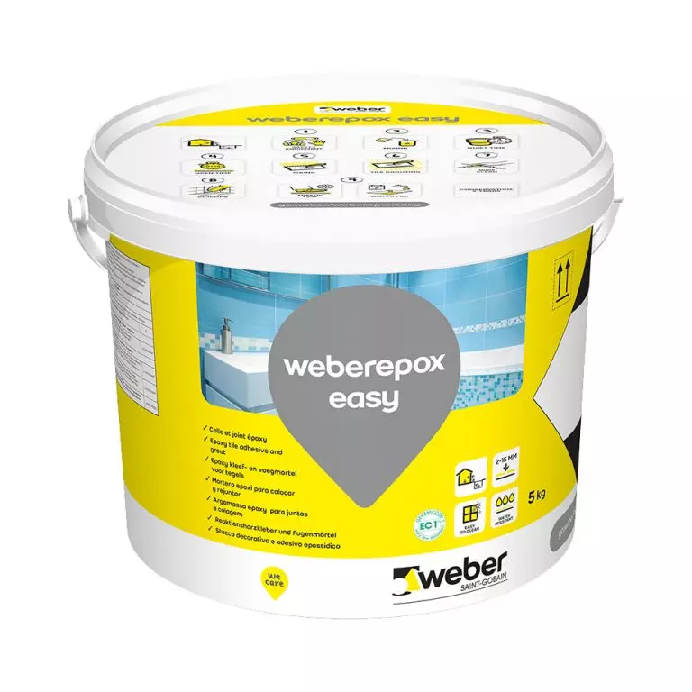 weberepox easy is a 2-component epoxy joint mortar for chemically resistant tiling joints. Can also be used for fixing tiles. Joint width 1 – 10 mm. Consumption as joint mortar 0.2 – 1.0 kg/m² depending on the size of the tile and the width of the joint. Delivery in a 5 kg package (includes components A + B).