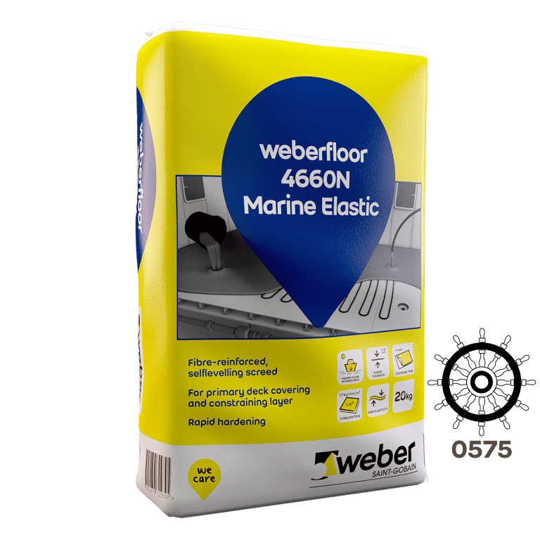 weberfloor 4660N Marine Elastic is a self-levelling cement-based, pumpable, fibre-reinforced material designed for use in marine and offshore installations as an underlayment for floor coverings such as PVC, vinyl, linoleum, epoxy, stone and ceramics, carpets etc. 4660N Marine Elastic satisfies the requirements of the authorities and classification bodies for primary deck coverings.