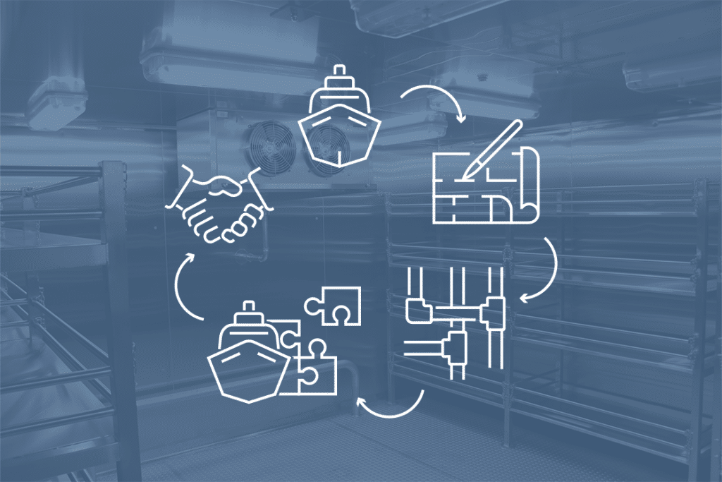 - We build the cold and freezer rooms from precast floor, wall, and ceiling elements, which fit together perfectly. The measurements are also ascertained to fit the ship’s hull precisely. The precast elements are manufactured at our partner’s factory.